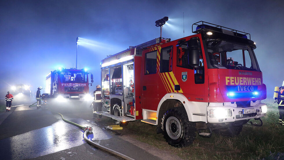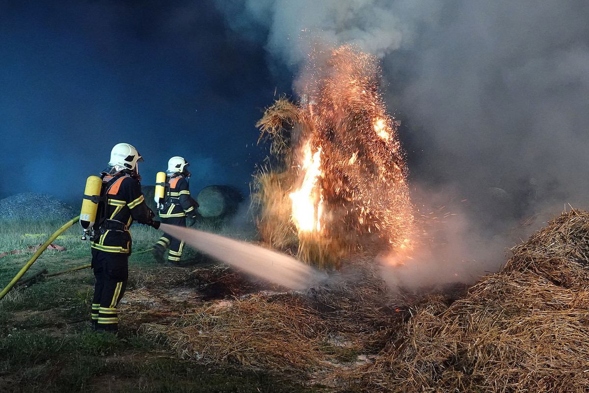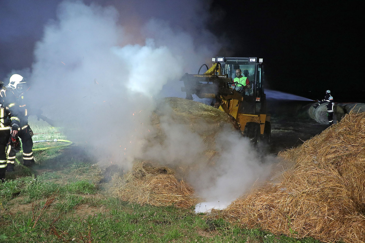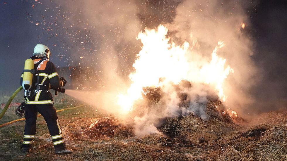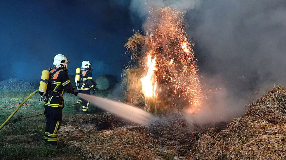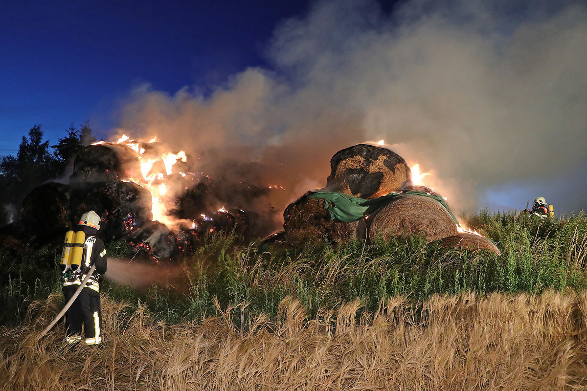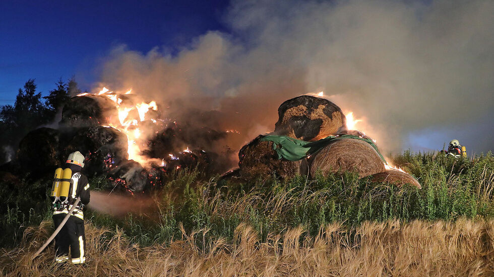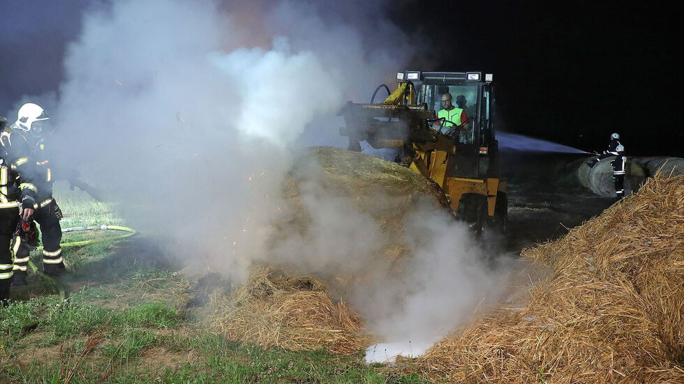 Die Feuerwehr wurde bei den Löscharbeiten auch von Bauern mit Löschwasser und Landmaschinen unterstützt. Die Polizei ermittelt zur Brandursache. Auch eine mögliche Selbstentzündung wird untersucht.
