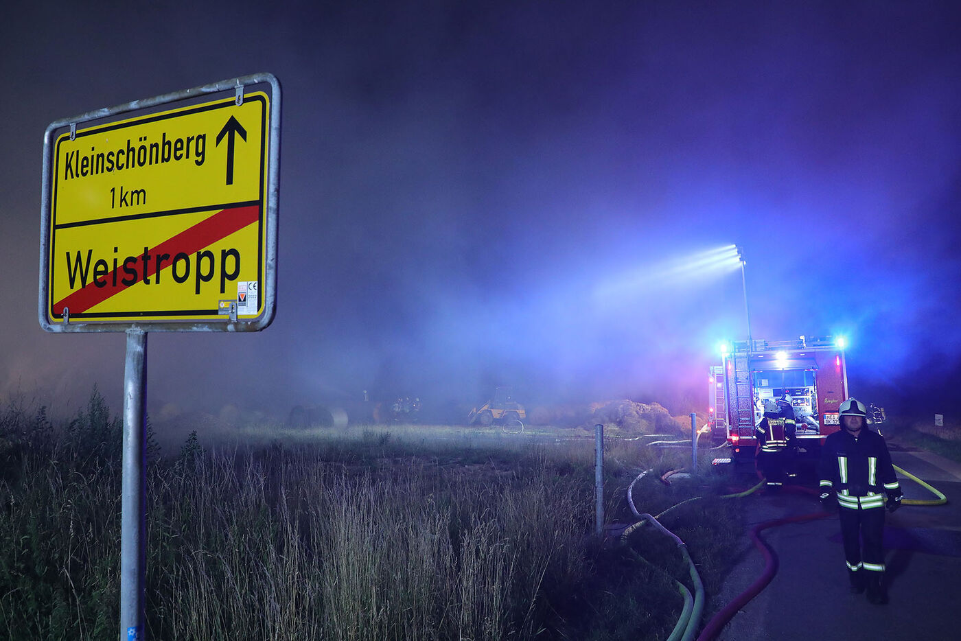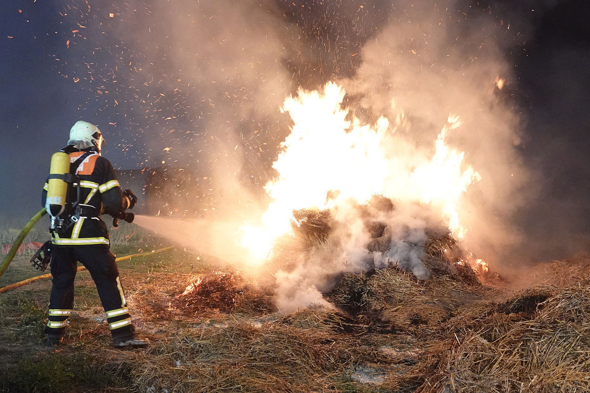 In Weißtropp im Kreis Meißen sind am Dienstagabend zahlreiche neben der Straße gelagerte Strohballen in Flammen aufgegangen. Die Feuerwehr wurde gegen 21:15 Uhr alarmiert. Die Kräfte aus Coswig, Klipphausen und Meißen konnten ein Ausbreiten des Feuers auf ein angrenzendes Feld verhindern.