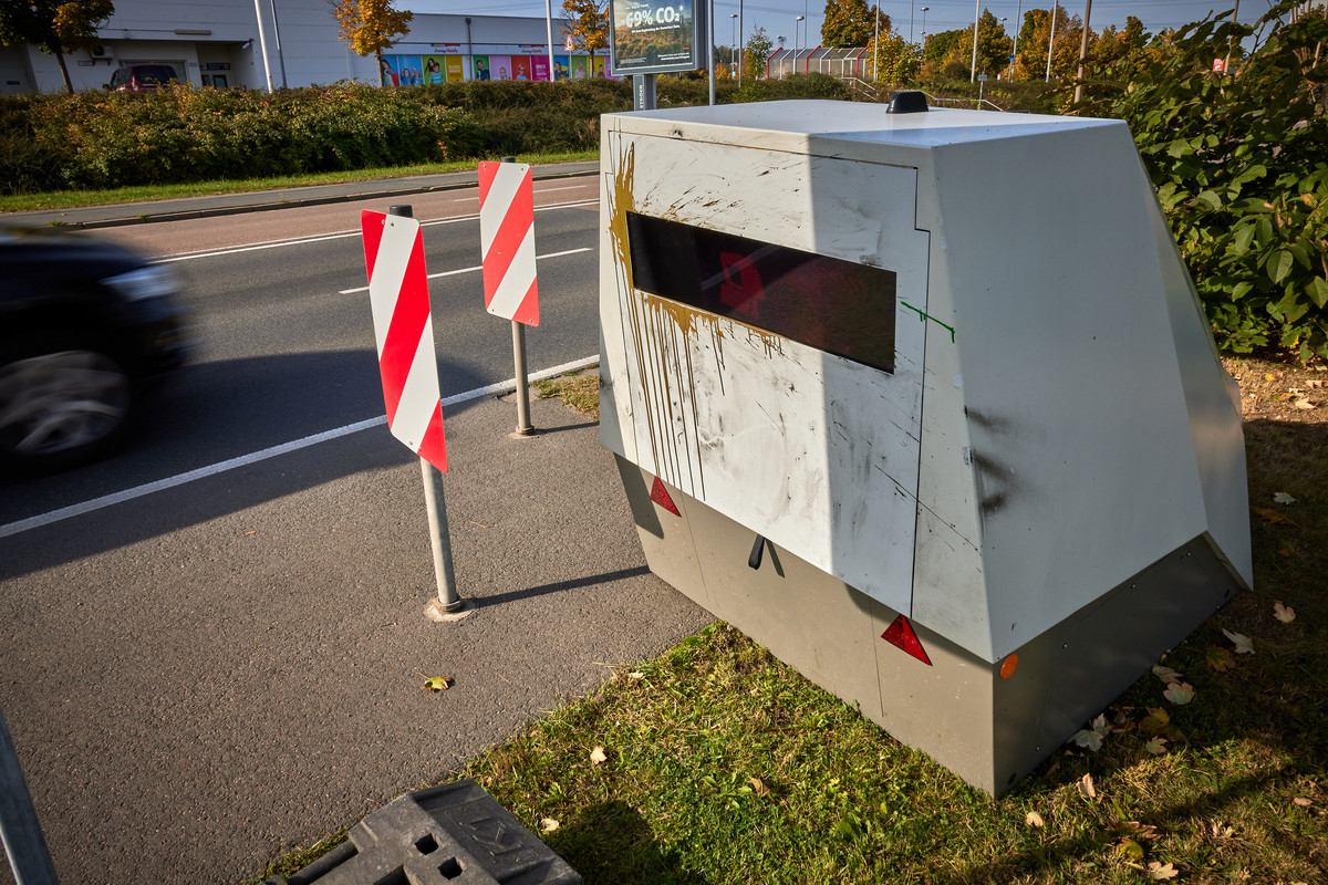 Erst in der Nacht zu Samstag war so ein Super-Blitzer auf der Merseburger Chausee in Leipzig-Dölzig attackiert worden. Unbekannte hatten ihn mit Pyrotechnik so schwer beschädigt, dass er abgeschleppt werden musste.