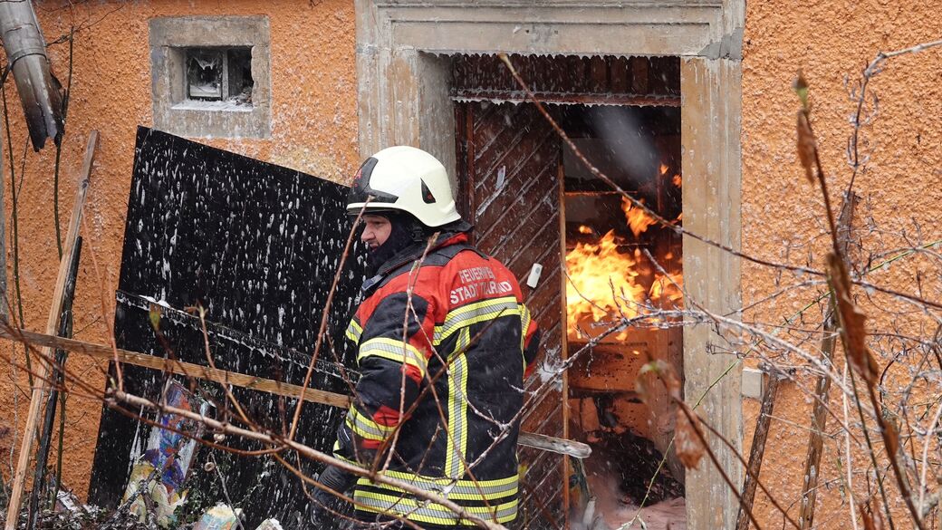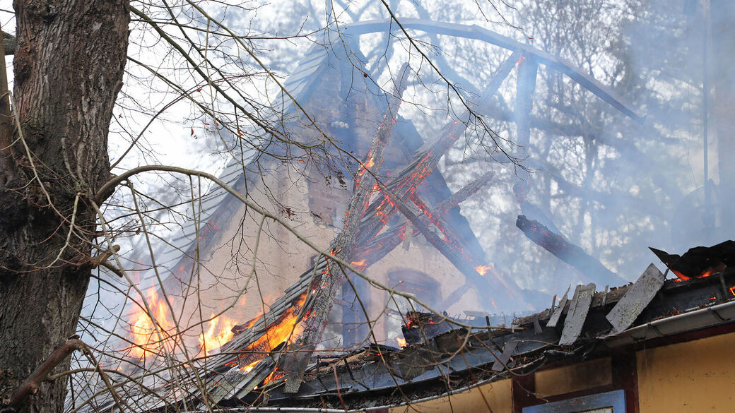 Laut Polizei wurde das Feuer am Montagvormittag gegen 8 Uhr gemeldet. Die Feuerwehr kämpfte stundenlang gegen die Flammen, doch das Gebäude an der Talmühlenstraße war nicht mehr zu retten.