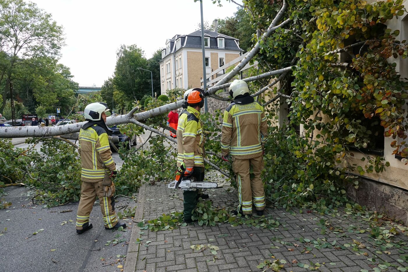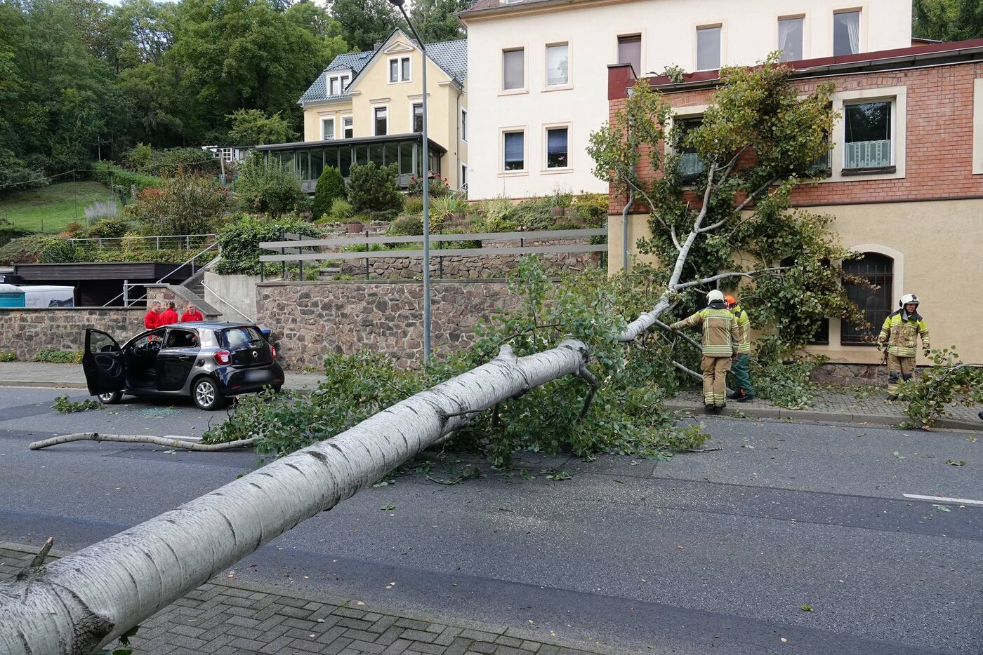 Glück im Unglück hatte eine Autofahrerin auf der Tharandter Straße. Zwischen dem Tunnel und der Autobahnbrücke über den Plauenschen Grund kippte ein Baum um und fiel auf den fahrenden Smart. Zudem traf die Linde auch noch ein Wohnhaus. Die Autofahrerin kam mit dem Schrecken davon: Sie musste nicht ins Krankenhaus und wurde vor Ort ärztlich untersucht. Allerdings entstand am Kleinwagen Totalschaden. Der Schaden am Haus hält sich in Grenzen.