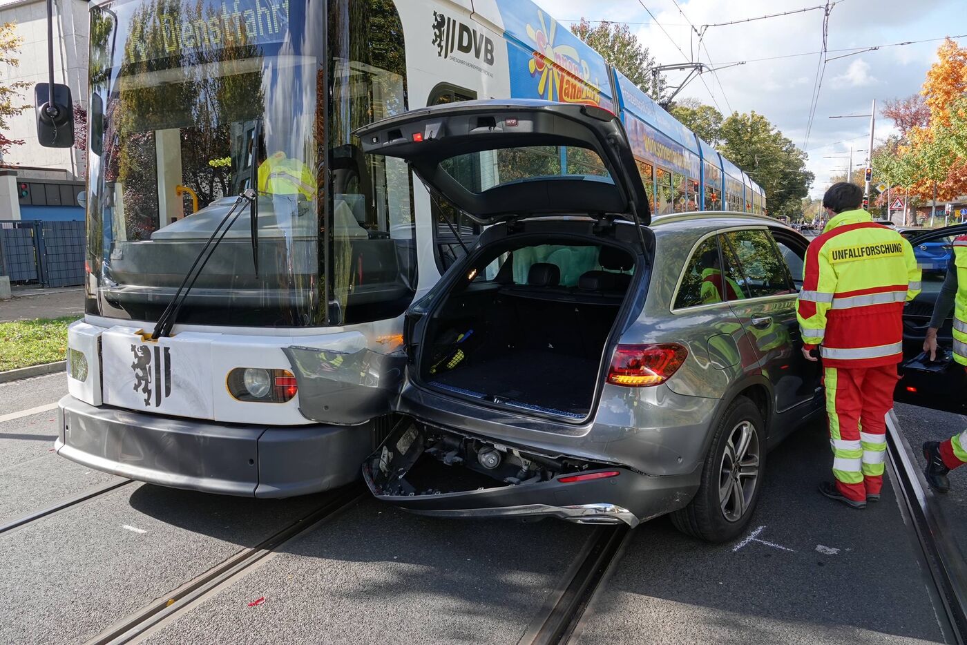 Ein Mercedes ist am Montagnachmittag mit einer Straßenbahn der Dresdner Verkehrsbetriebe (DVB) zusammengestoßen. Laut Polizei war der 84-jährige Autofahrer auf der Tiergartenstraße in Richtung Karcherallee unterwegs, als er bei einem Wendemanöver seitlich mit der Bahn (Fahrerin 58) zusammenstieß.