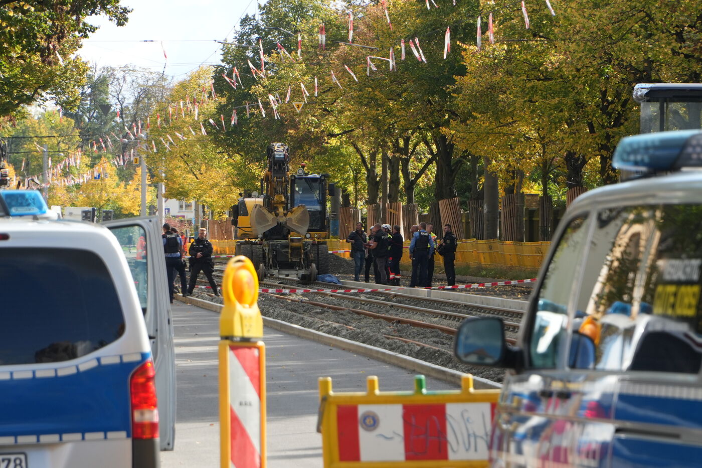 Prager Straße: Blick auf die Unfallstelle. Der Bagger soll den Bauarbeiter überfahren haben.