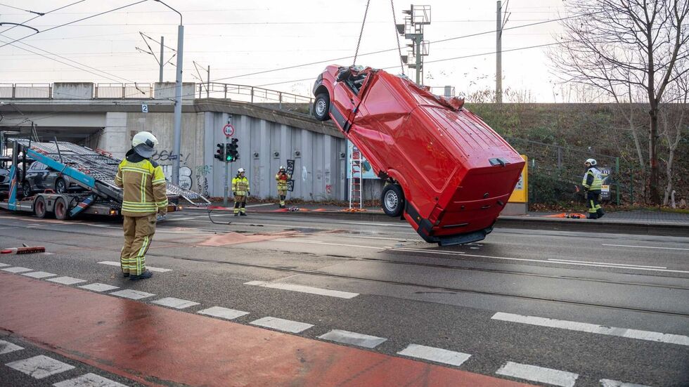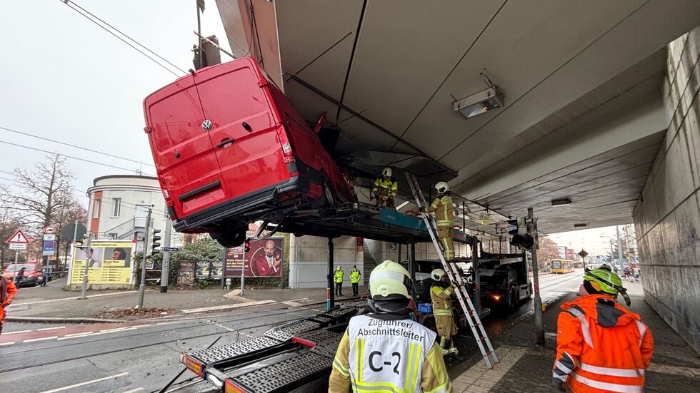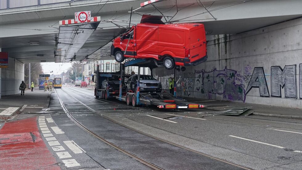 Transporter bleibt an Brücke in Dresden „kleben“
