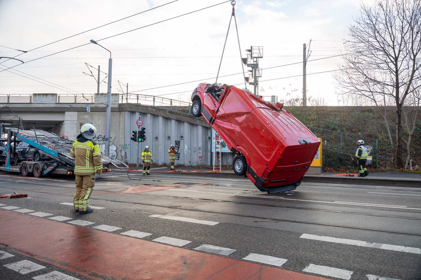 Zu Schaden kam nach ersten Informationen zufolge niemand. Die Oberleitung der Straßenbahn wurde jedoch stark beschädigt - Bahnhof und Straße waren für die Einsatzdauer gesperrt.