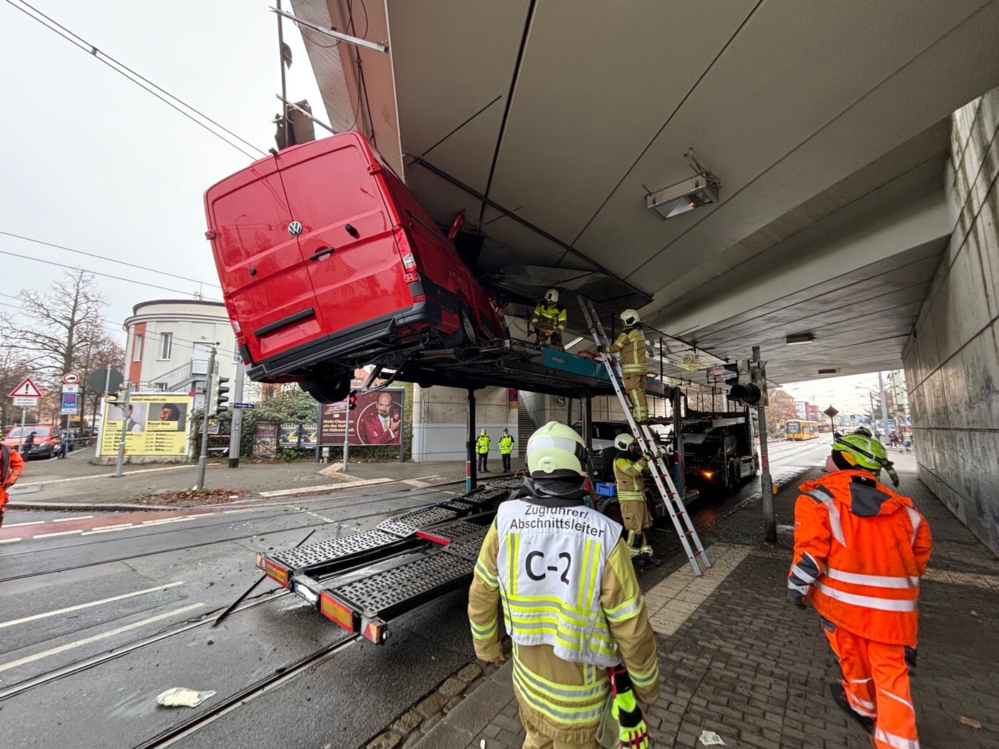 Transporter bleibt an Brücke in Dresden „kleben“