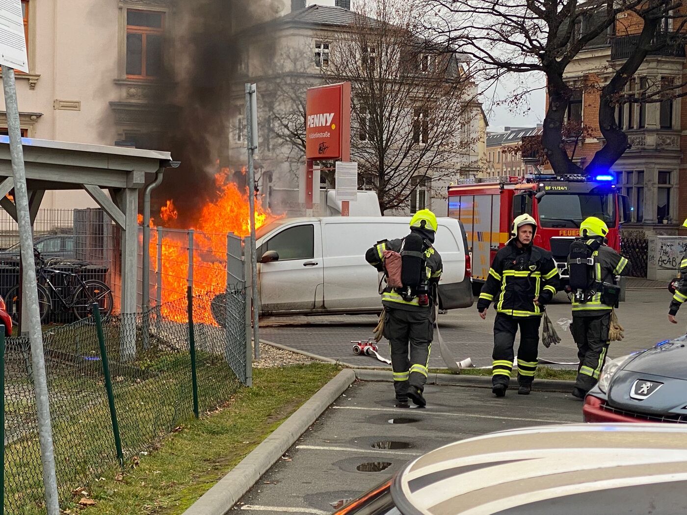 Auf dem Penny-Parkplatz in der Hölderlinstraße in Zwickau hat am frühen Dienstagnachmittag ein Lieferwagen gebrannt. Gegen 14 Uhr rückte die Feuerwehr aus.