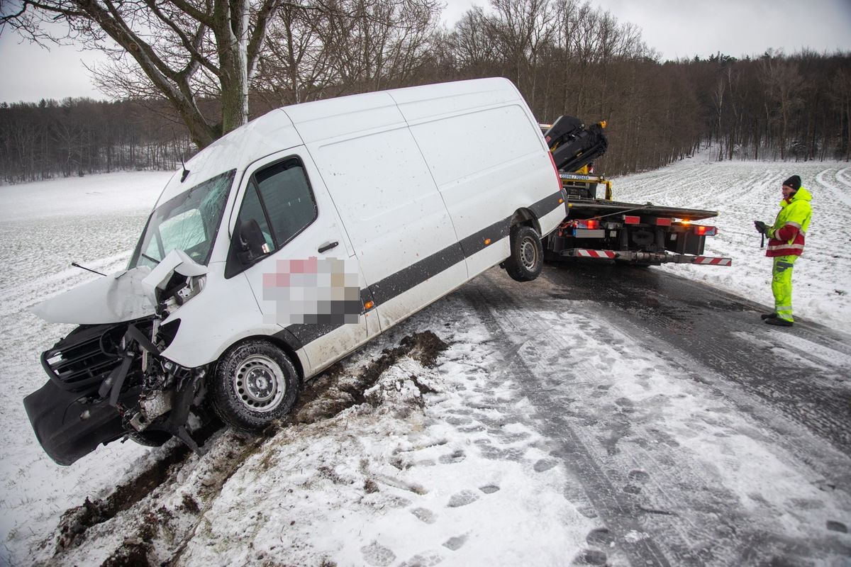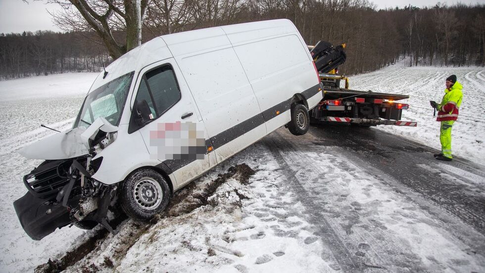 Der Mercedes-Transporter drohte umzukippen und musste aufwändig geborgen werden. Dafür wurde die Straße etwa zwei Stunden lang voll gesperrt.