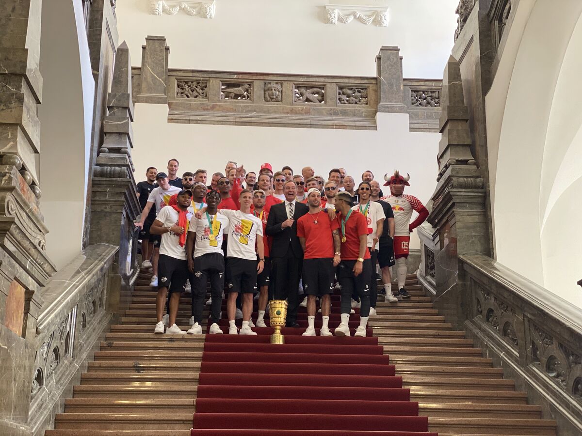 Oberbürgermeister Burkhard Jung hat die DFB-Pokalsieger von RB Leipzig für ihre Rolle als Botschafter der Stadt gewürdigt. „Ein großartiger Sieg. Wir sind echt stolz“, sagte der SPD-Politiker beim Empfang im Neuen Rathaus. „Es ist natürlich für die Stadt ein Wahnsinns-Marketing.“