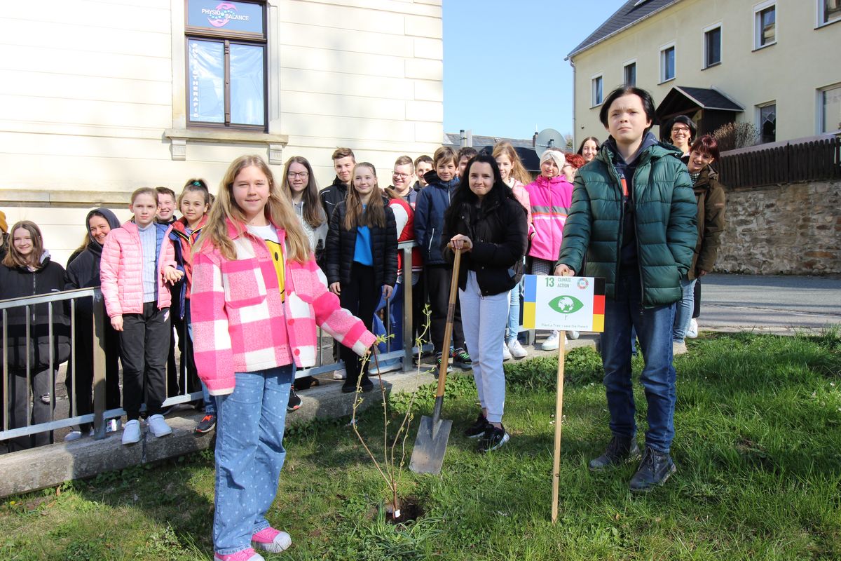 Ukrainische und deusche Schüler pflanzen Baum am Gymnasium Olbernhau
