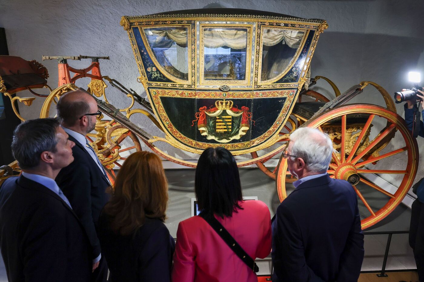Finanzminister Christian Piwarz (2.v.l.) besichtigt den sächsischen Gesandschaftswagen zur Kaiserkrönung am 9. Oktober 1790 im neu konzipierten Kutschenmuseum auf Schloss Augustusburg.