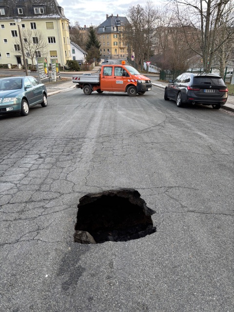 Großer Schreck in Reichenbach. Dort hat sich am Donnerstag mitten auf der Karl-Liebknecht-Straße ein großes Loch aufgetan. Polizei und Freiwillige Feuerwehr wurden gegen 15 Uhr zu dem Straßeneinbruch alarmiert.