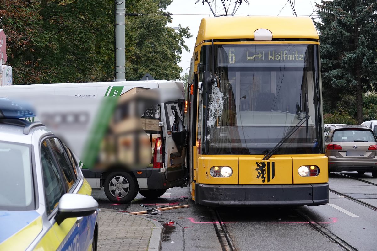 Wie unser Reporter berichtete, war der Fahrer eines Renault gegen 9 Uhr mit einer Bahn der Linie 6 zusammengestoßen. Dabei wurde der Autofahrer leicht verletzt. An seinem Wagen entstand wohl ein Totalschaden. Auch die Straßenbahn wurde beschädigt, sie konnte jedoch noch eigenständig bis zum Betriebshof Gorbitz fahren.