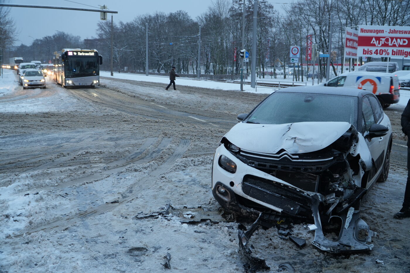 Wegen des (kleinen) Wintereinbruchs hat es in der Region Leipzig am Montagmorgen knapp 50 Verkehrsunfälle gegeben, wie uns die Polizei auf Anfrage sagte. Schwer verletzt wurde zum Glück nirgendwo jemand. Hier auf den Bildern ist ein Unfall zu sehen, der gegen 7 Uhr auf der Kiewer Straße / Ecke Lützner Straße passiert ist. Es kam zu Verkehrsbehinderungen. Die Polizei mahnt in diesem Zusammenhang erneut zu angepasstem Fahren bei Schnee und Glätte.