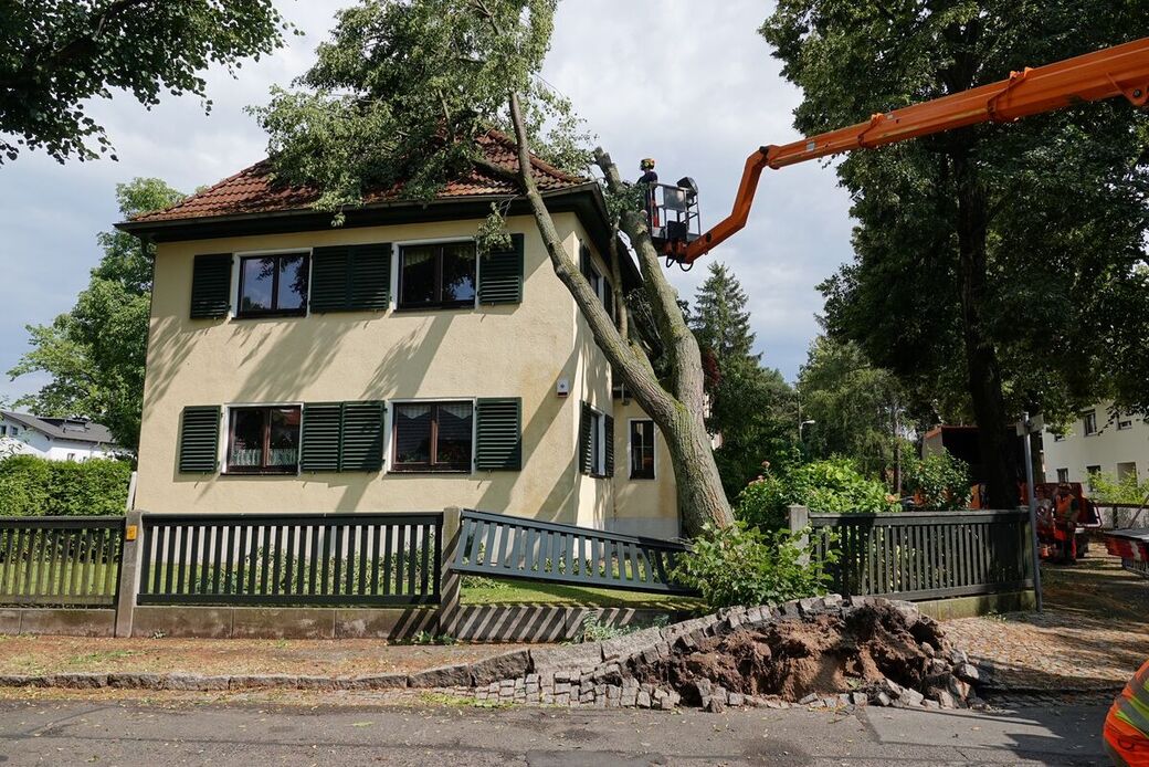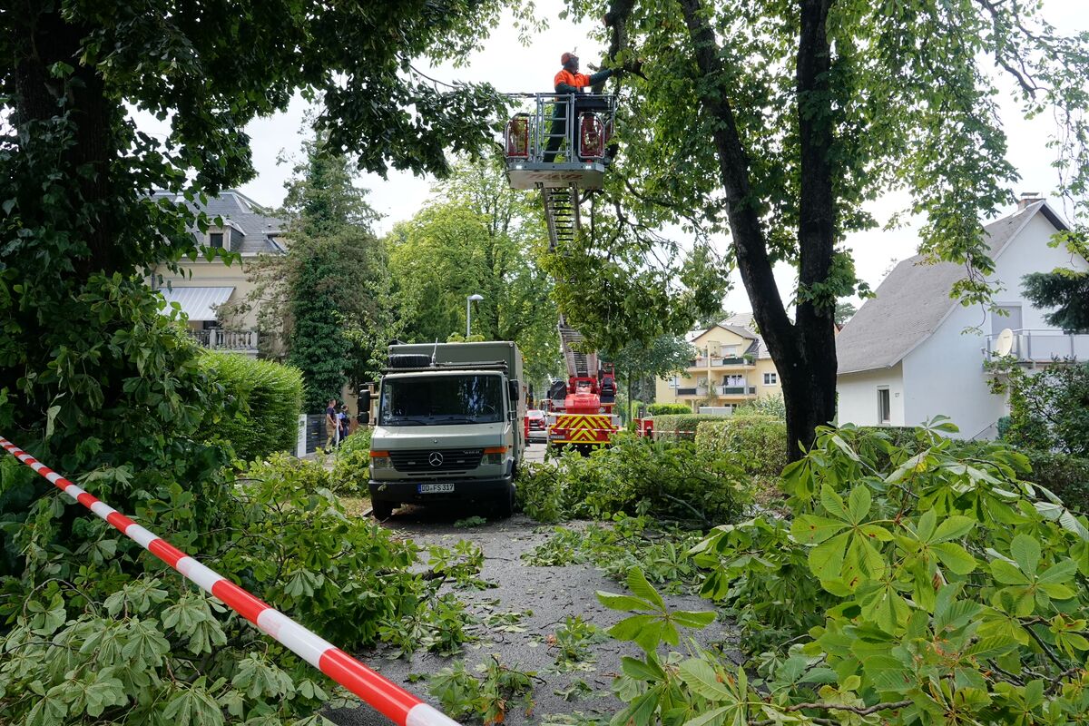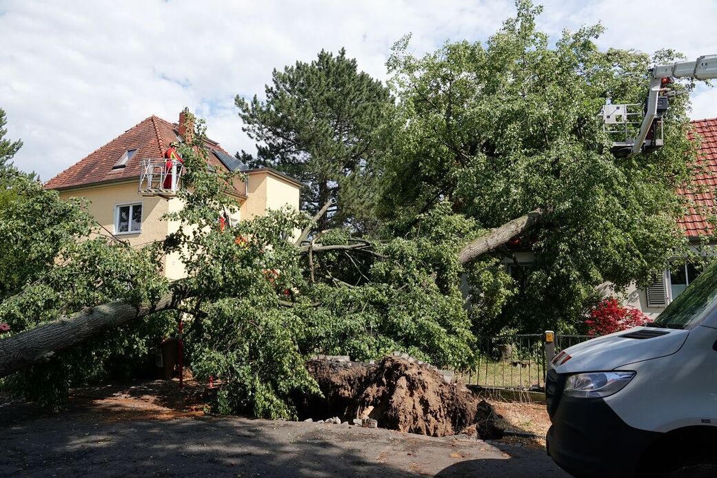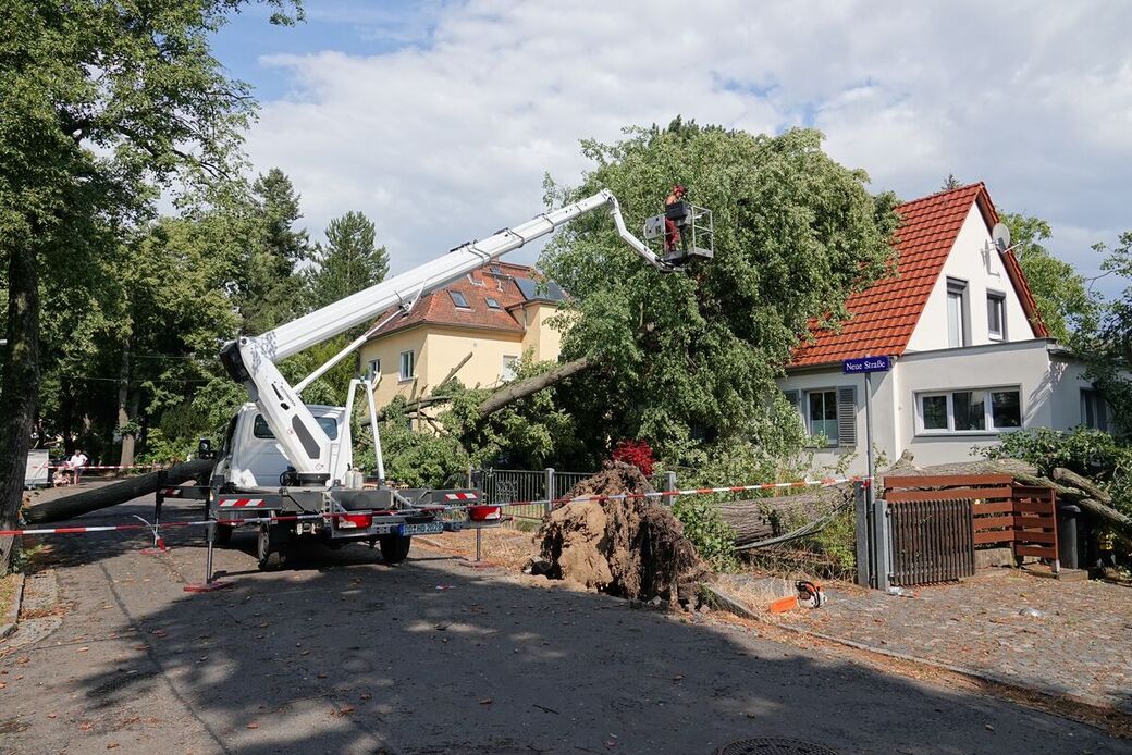 Größere Einsätze gab es nicht. „Es waren meist Einzelbäume. Wir hatten aber zum Beispiel auf der Bertold-Brecht-Straße einen kompletten Straßenzug, wo die Bäume nach und nach umgeknickt sind.“ Bis zum Abend sollen alle Einsätze beendet sein.