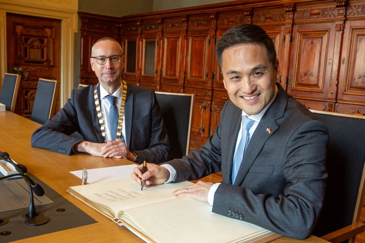 - Der Generalkonsul beim Eintrag in das Goldene Buch der Stadt Bautzen. Oberbürgermeister Karsten Vogt (l.)