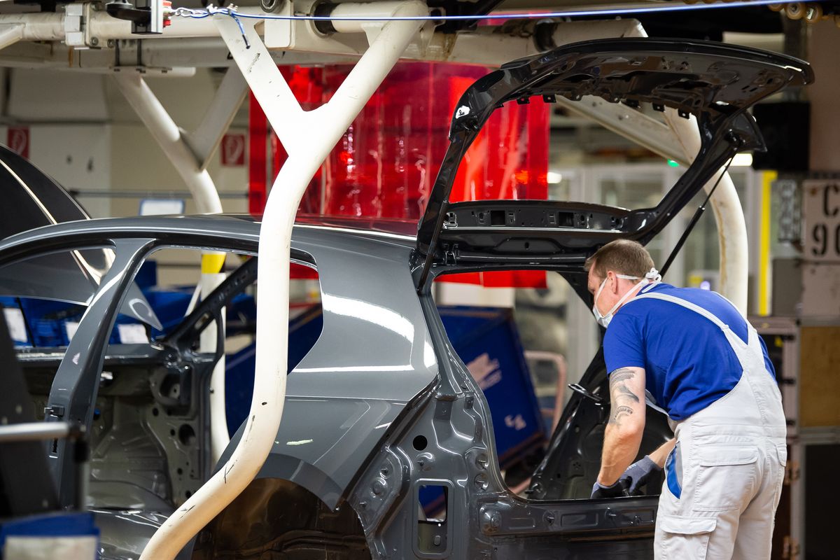 Ein VW-Mitarbeiter arbeitet an der Produktion eines Autos.