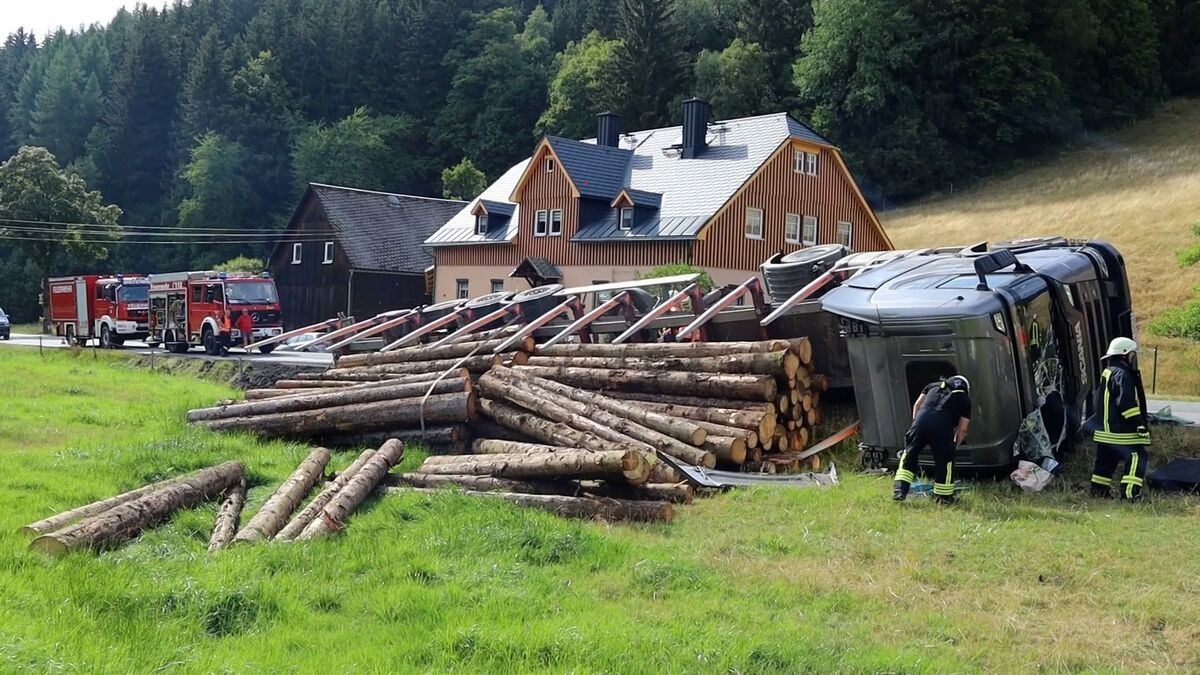 Vollbeladener Holzlaster umgekippt - Fahrer verletzt