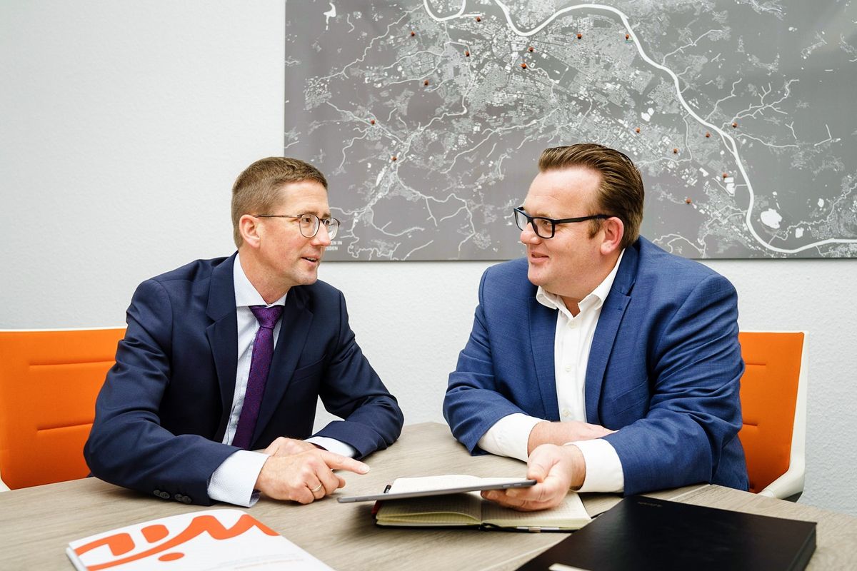 Sebastian Krüger (rechts), Regionalbereichsleiter Vonovia Dresden übergibt das Portfolio für einen möglichen Ankauf an WiD-Geschäftsführer Steffen Jäckel (links)
