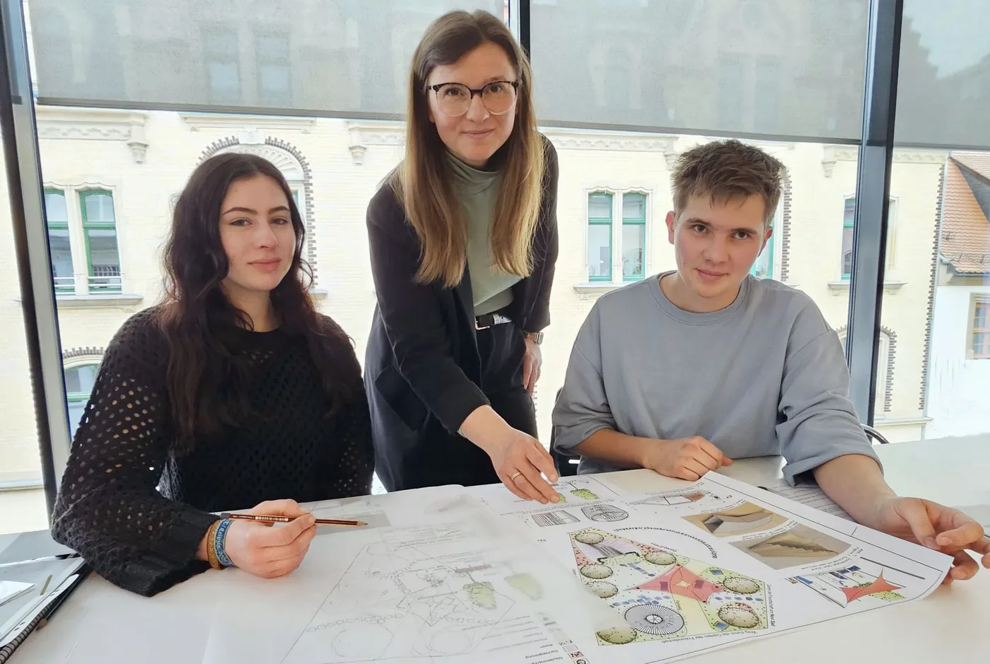 - Baubürgermeisterin Silvia Queck schaut Emma Jenkner und Lennox Schiecke über die Schulter.