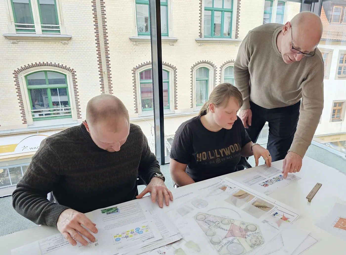 - v.l.: Tobias Körner, Madlen Gündel und Tilo Küttler sichten Gestaltungsvarianten.