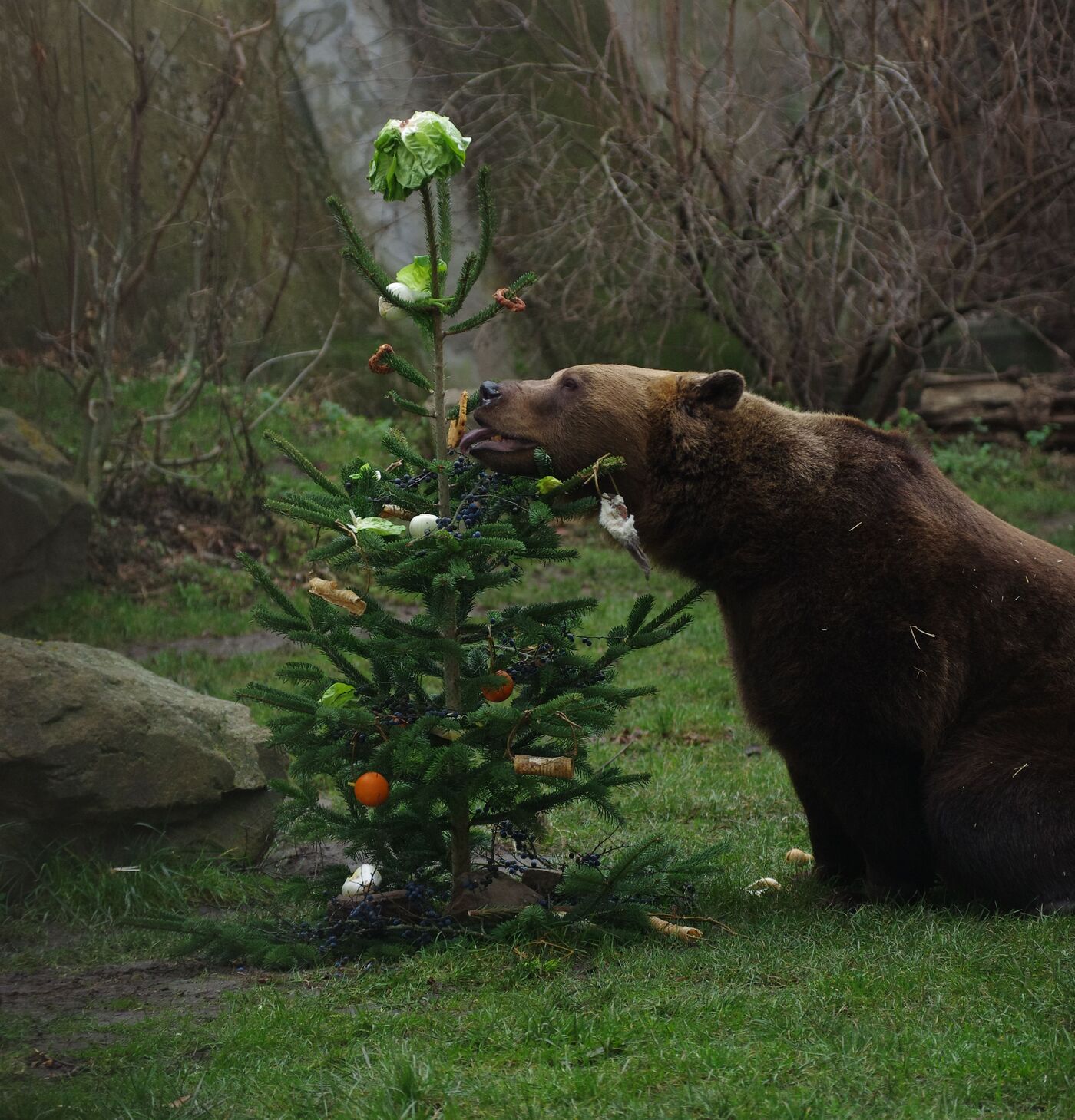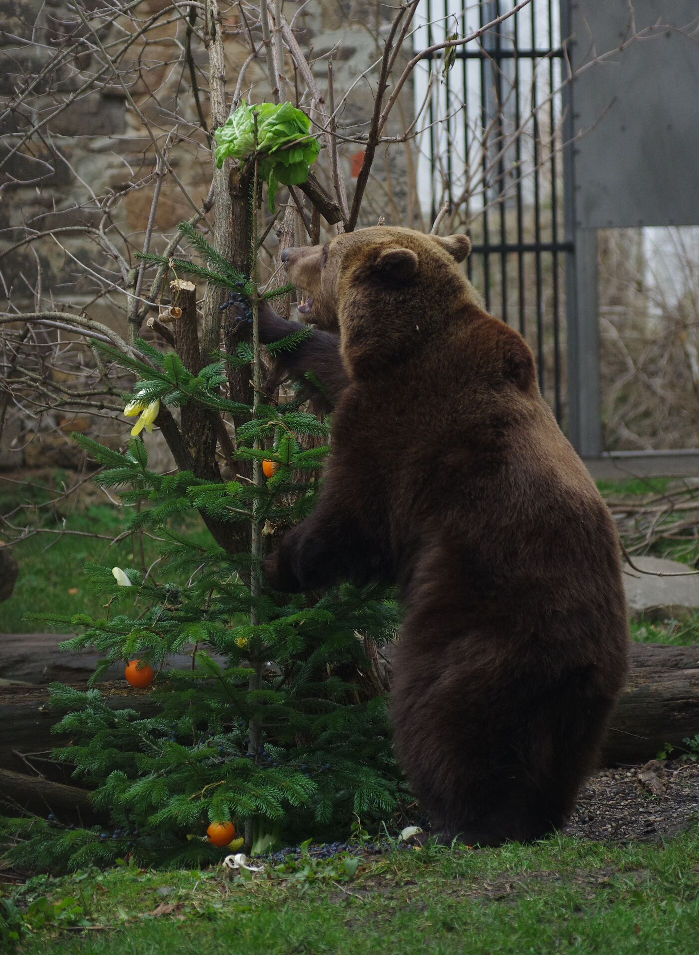 Bea und Benno, die beiden Braunbären im Gehege von Schloss Hartenfels in Torgau, durften sich kurz vor Heiligabend über eine besondere Leckerei freuen. Die Tierpflegerinnen des Landratsamtes – Heide Grieser, Susann Heinrich und Uta Betke – hatten zwei Nordmanntannen mit Kau-Stangen, Fenchel, Nüssen, Salat und Obst geschmückt.