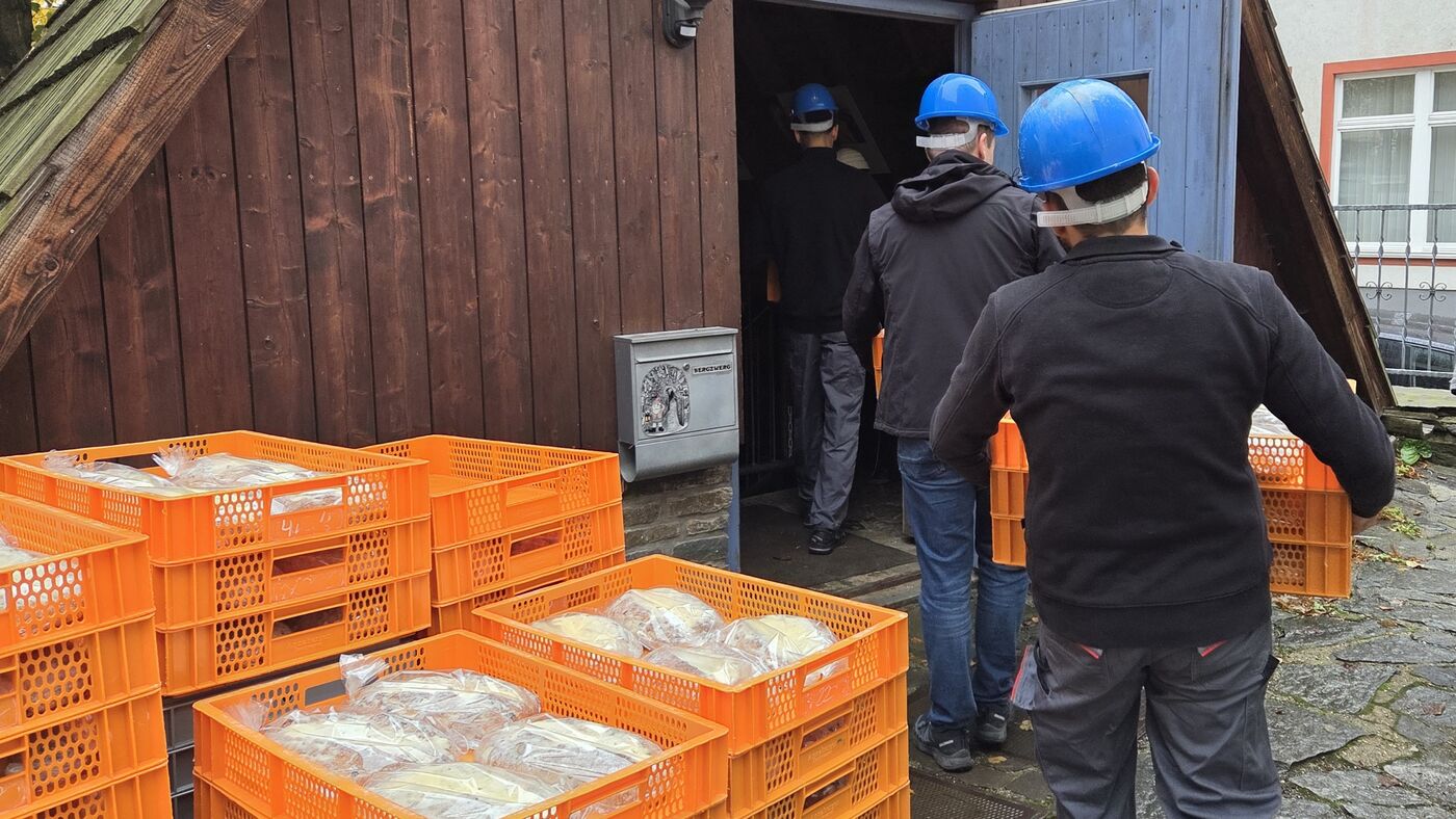 Bei den eingelagerten Stollen handelt es sich um Erzgebirgische Butterstollen, die mit dem Snaps „Grubenfeuer“ veredelt wurden. Insgesamt 555 Stück der limitierten Sonderauflage der Annaberger Backwaren wird es dieses Jahr wieder geben.