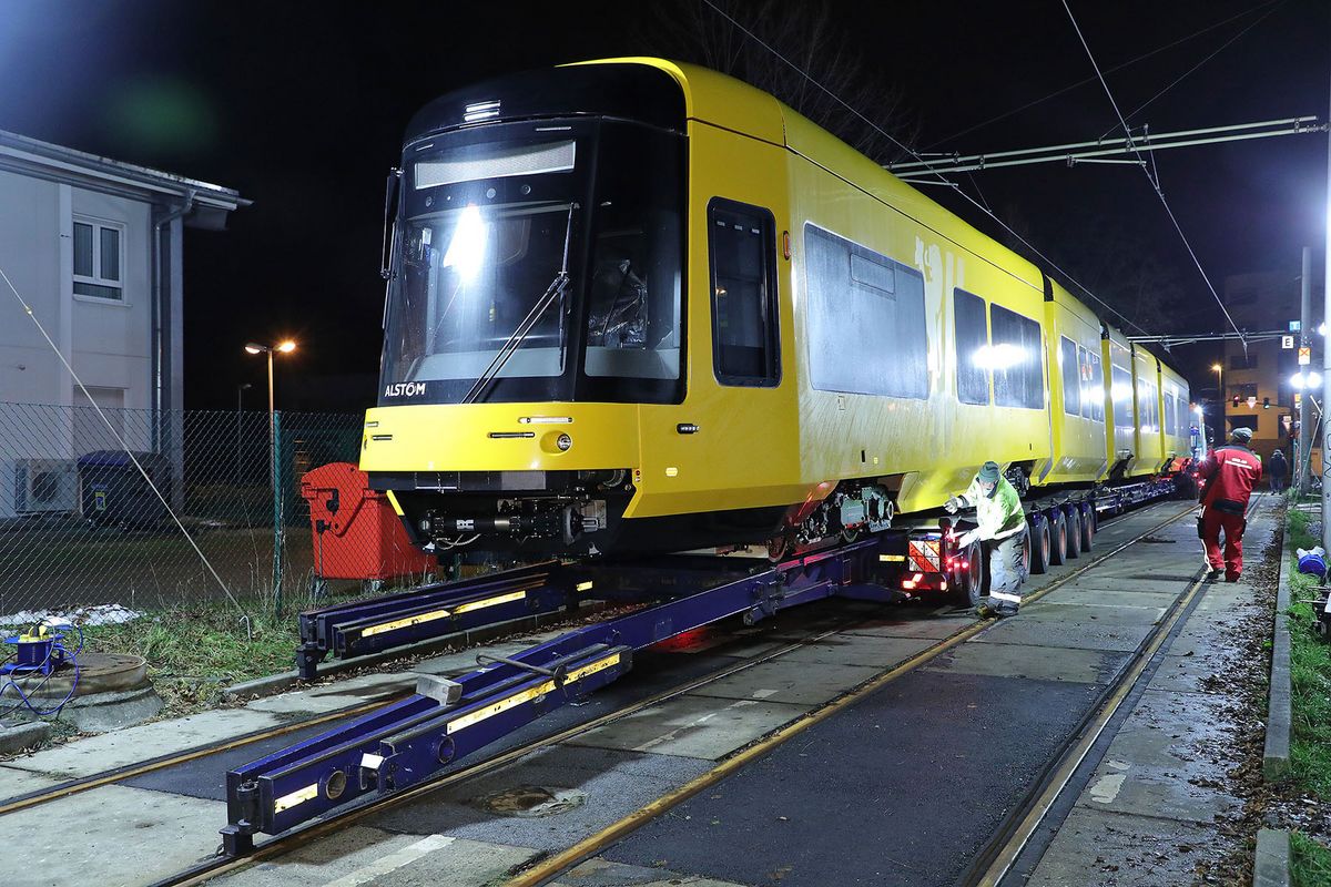Mit einem Schwerlasttransport rollte die fünfte von 30 Bahnen des Typs NGT DX DD vom Bautzner Werk des Herstellers Alstom nach Dresden. An der Fröbelstraße wurde die 43 Meter lange und 53 Tonnen schwere Bahn abgeladen und anschließend in den Betriebshof Gorbitz geschleppt.