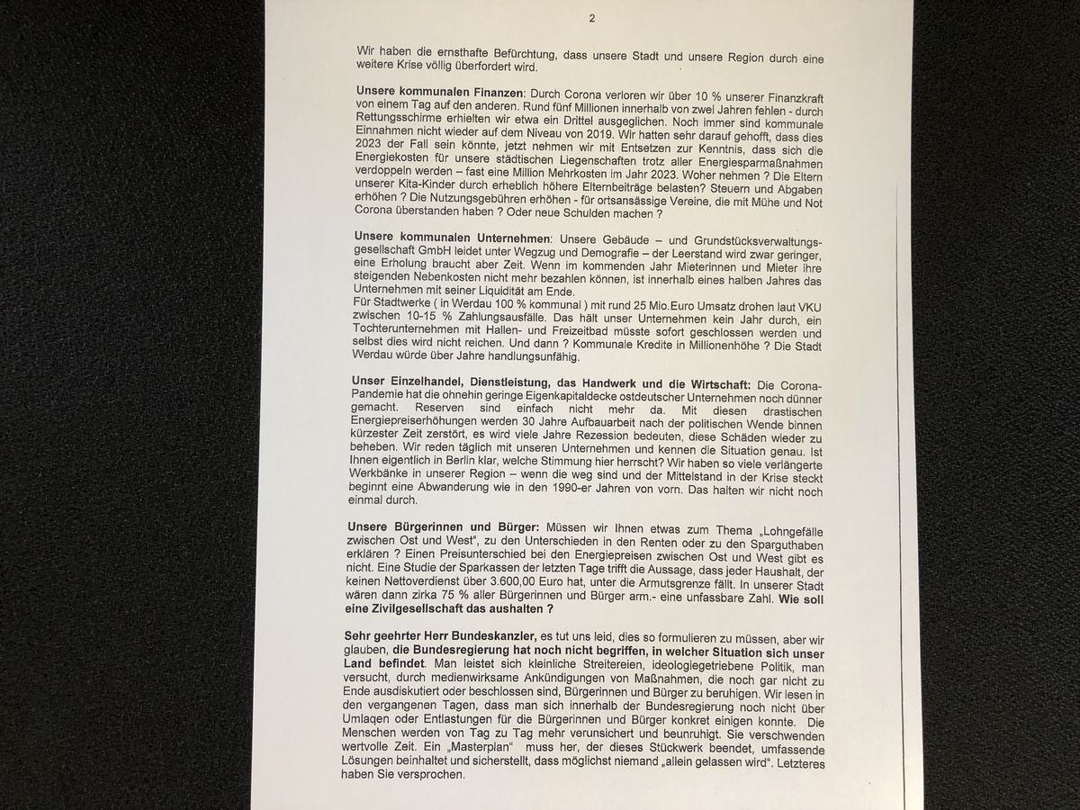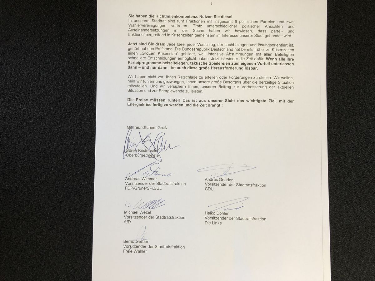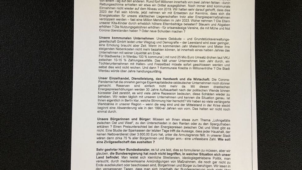 Die Briefschreiber gehen auf die finanziellen Verluste ein, die die Stadt schon durch Corona erlitten habe, sie befürchten zahlungsunfähige Bürger, ein Firmensterben und Abwanderung wie in den 90er-Jahren. Das sei nicht noch einmal durchzuhalten. „Wir haben die Befürchtung, dass unsere Stadt durch eine weitere Krise völlig überfordert wird“, so die Unterzeichner.