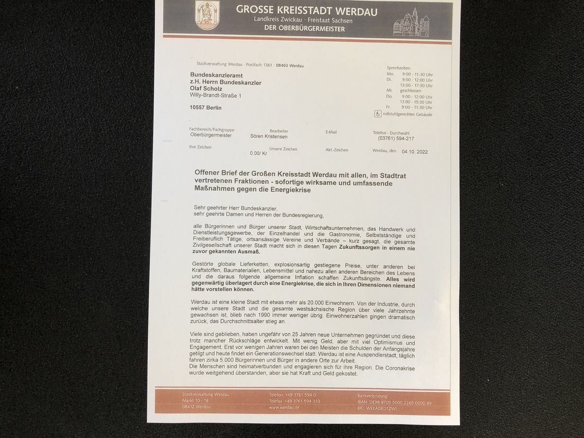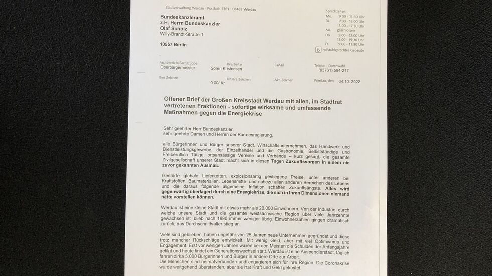 Werdau appelliert eindringlich an die Bundesregierung, noch mehr gegen die explodierenden Energiepreise zu tun. Oberbürgermeister Sören Kristensen und alle Fraktionschefs im Stadtrat haben einen offenen Brief an Kanzler Olaf Scholz und die Minister verfasst.