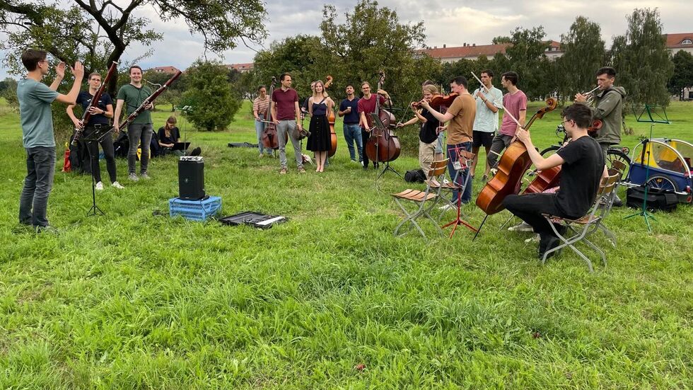 Okay, die Pauken haben gefehlt, doch das kommt noch. Denn genau das ist das Prinzip der Aktion vom Werkstatt Orchester Dresden e.V, sagt Dirigent Joschua Lettermann. Jeder Musiker mit Instrument und Stimme ist eingeladen mitzumachen.