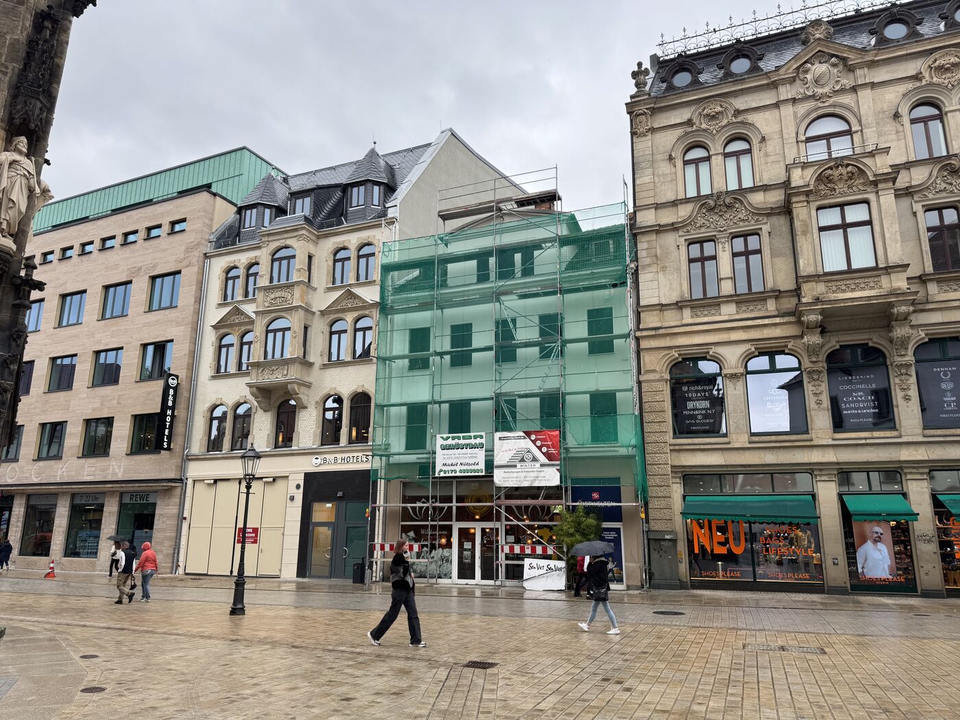 Marienplatz 2 (eingerüstet). Links davon ein Teil des frisch sanierten Schocken-Komplexes.
