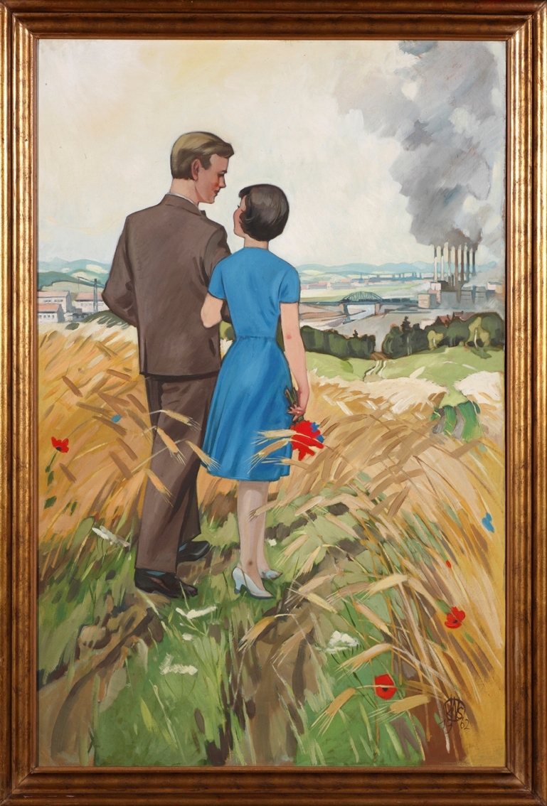 - Karl Wilhelm Schmidt, Liebespaar durch Kornfeld laufend, im Hintergrund Kraftwerk, 1962