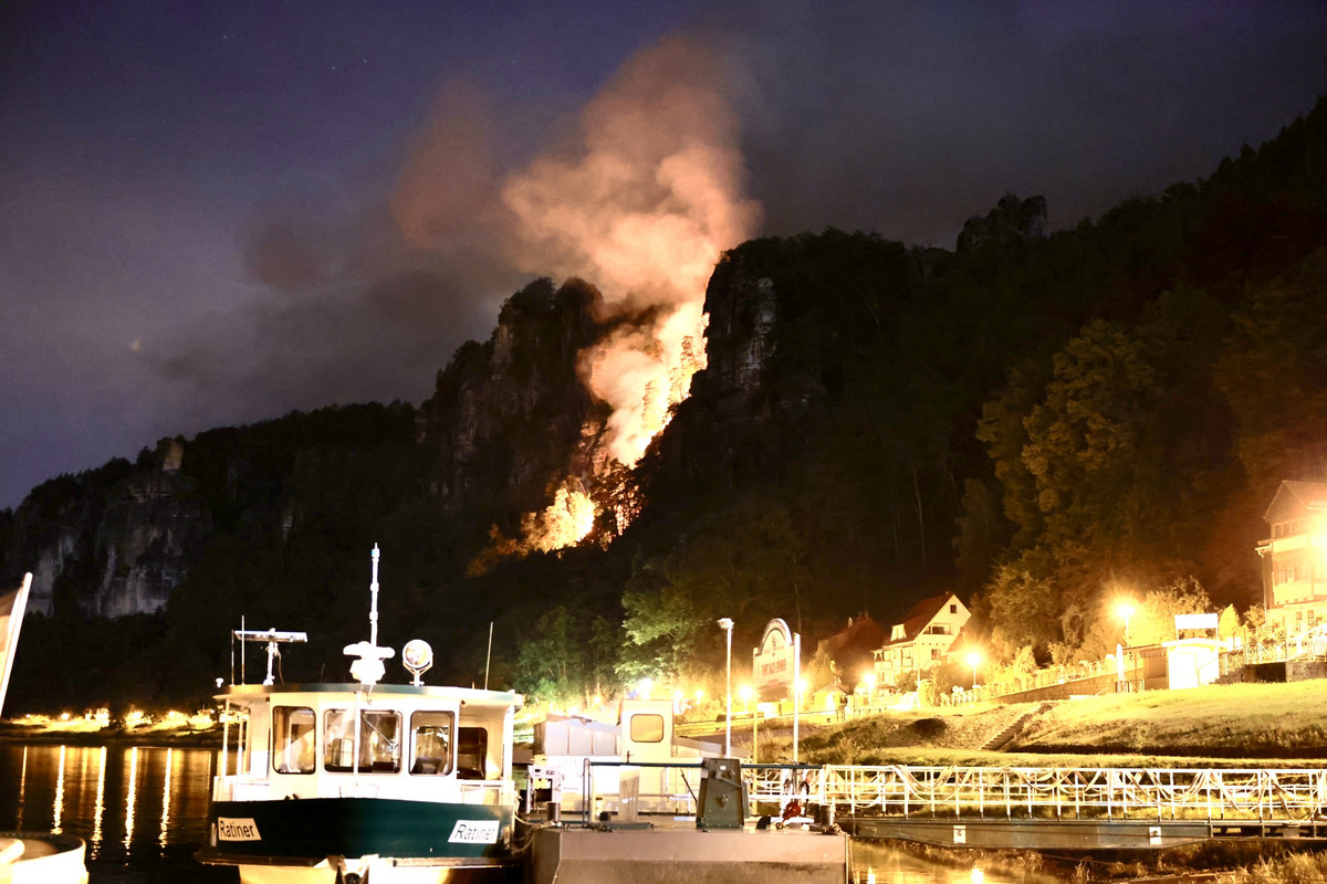 Das Feuer war in der Nacht zu Montag unterhalb der Basteibrücke ausgebrochen und hatte auf einer Fläche von 2.500 Quadratmetern gewütet. Mehr als 100 Feuerwehrleute waren im Einsatz. Die Arbeiten waren sehr schwierig, weil es an einem Steilhang mit 190 Meter Höhenunterschied brannte. Großteils mussten sich die Einsatzkräfte mit Seilen absichern.
