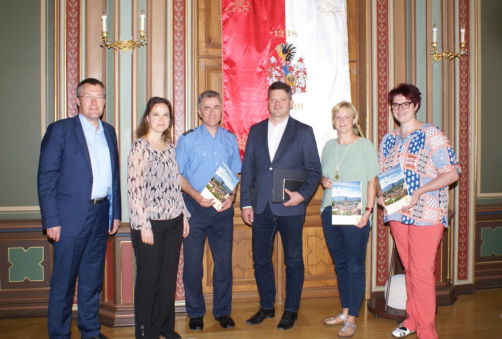 v.l.n.r.: Michael Hillmann – Coach B3 Institut, Manuela Greschuchna – Koordinatorin Kommunaler Präventionsrat Zittau, PD Carsten Weber – Leiter Polizeirevier Zittau-Oberland, Thomas Zenker – Oberbürgermeister der Stadt Zittau, Marei Sonntag – Leiterin Amt für Bildung und Soziales der Stadtverwaltung Zittau und Denise Gührig – Leiterin Bürgeramt der Stadtverwaltung Zittau.